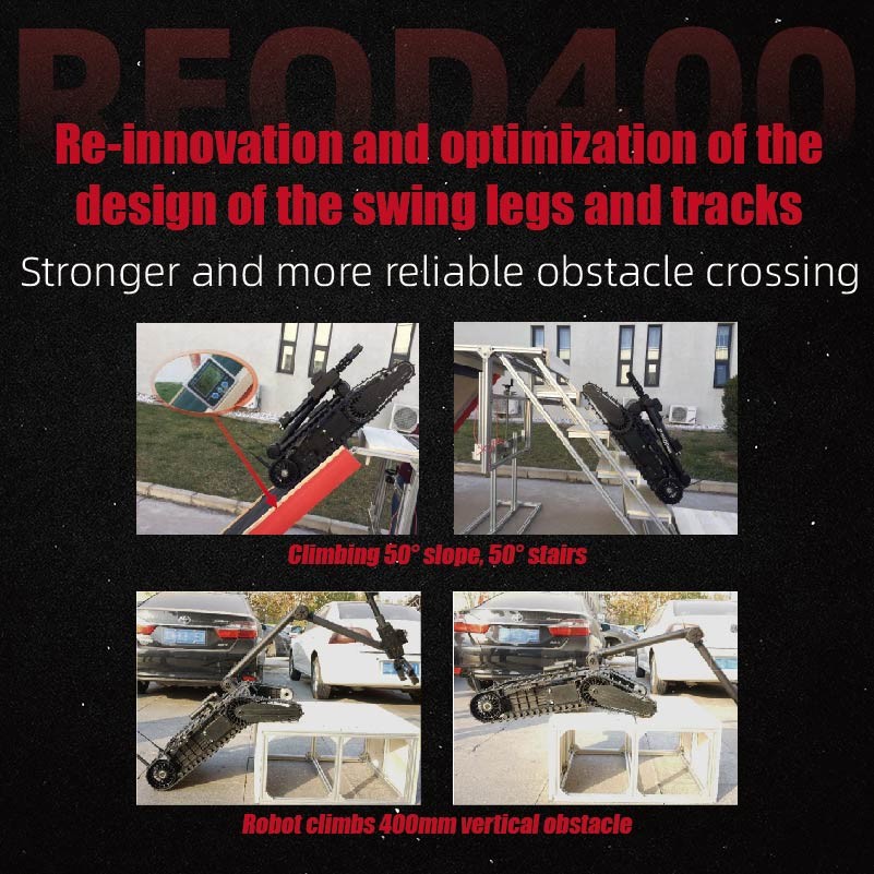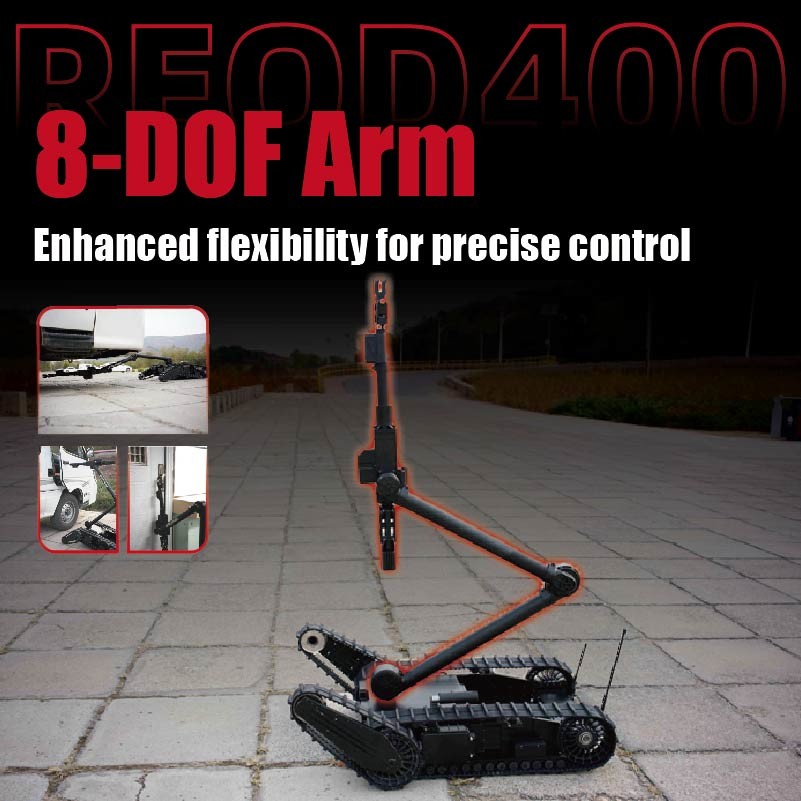 REOD400 로봇 팔은 8도 자유의 통합 디자인을 갖추고 있으며 강력한 공간 범위를 제공합니다.이 설계 는 로봇 팔 이 일반적 인 폭탄 제거 작업 뿐만 아니라 일반적 인 5도 또는 6도 자유 로봇 이 처리 할 수 없는 작업 을 수행 할 수 있게 해 준다높은, 낮은, 깊은 구덩이, 또는 테이블 톱 환경에서의 물체를 포착하는 것뿐만 아니라 높은, 낮은, 깊은 구덩이 환경에서 다각적 정찰을 수행하는 것.